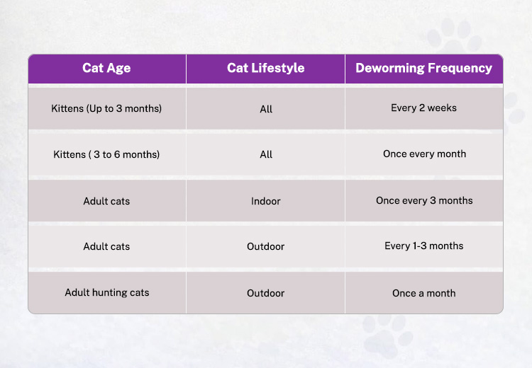 Remember, this table is for your guide only. The ideal deworming frequency for your cat may differ. It is recommended that you consult a vet for tailored deworming recommendations.
